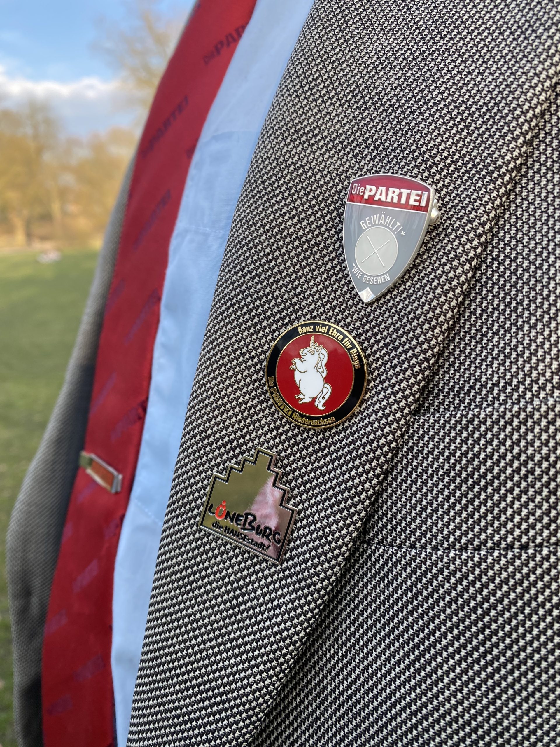 Ausgezeichnet fürs Engagement: Am Sakko trägt Keno das Wappen seiner Partei, der Stadt Lüneburg und einen Pin mit der Aufschrift „Ganz viel Ehre für Dings“